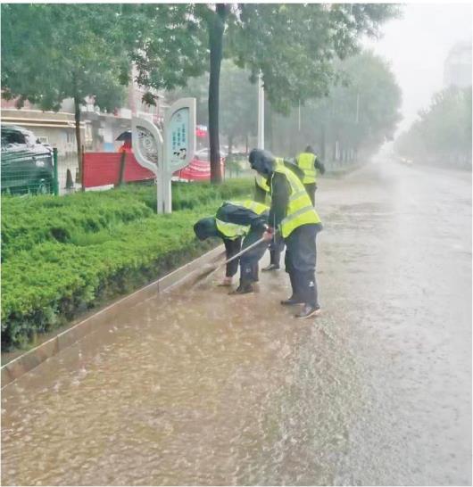 7月12日,聊城市城市管理局市政防汛大隊(duì)隊(duì)員在易澇地段清理下水井箅子。