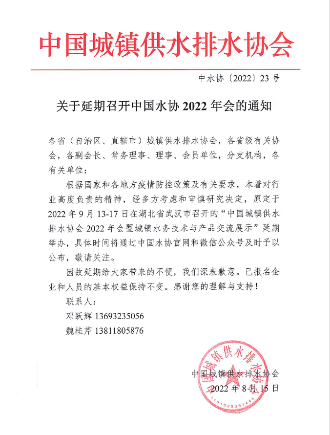 關(guān)于延期召開中國水協(xié)2022年會(huì)的通知