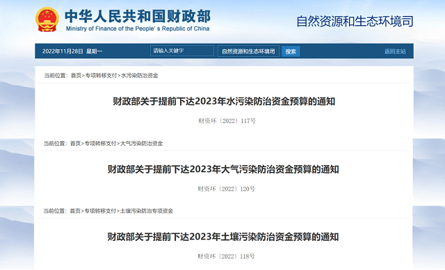 今年,來(lái)得最早的是水、土、氣3大污染防治和農(nóng)村環(huán)境整治資金。11月8日,財(cái)政部發(fā)布《關(guān)于提前下達(dá)2023年水污染防治資金預(yù)算的通知》、《關(guān)于提前下達(dá)2023年大氣污染防治資金預(yù)算的通知》、《關(guān)于提前下達(dá)2023年土壤污染防治資金預(yù)算的通知》和《關(guān)于提前下達(dá)2023年農(nóng)村環(huán)境整治資金預(yù)算的通知》,對(duì)上述4項(xiàng)資金做出了安排。