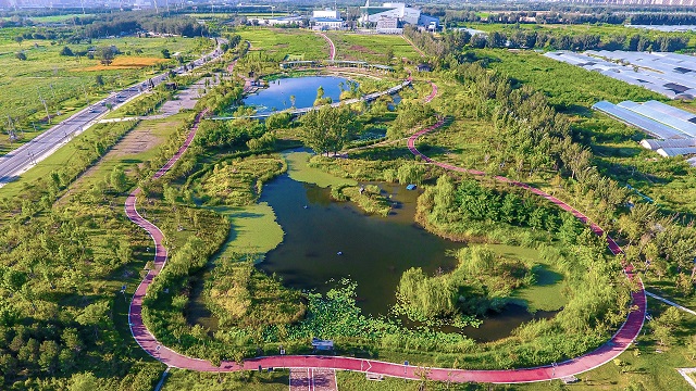 “我們通過利用植物與水系形成山水環境,把生態功能濕地、文化景觀元素、田園郊野風貌、濕地水系景觀進行有機融合,在大尺度上形成由北向南山林環繞,水系流動的空間格局。”牛奕娜介紹,“通過水生植物的吸收、濕地填料的吸附、微生物的分解等方式能夠削減面源污染,穩定河道水質和保護河道水生態系統的健康。”