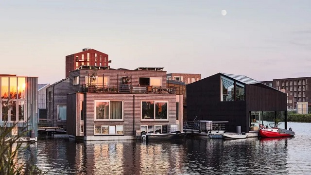 過(guò)去幾年,“漂浮住宅”的理念也逐漸興起。在阿姆斯特丹北部的斯孔奇普社區(qū),Space&Matter建筑公司設(shè)計(jì)了30座水上住宅。項(xiàng)目于2021年竣工,目前已吸引了100多位住戶。
