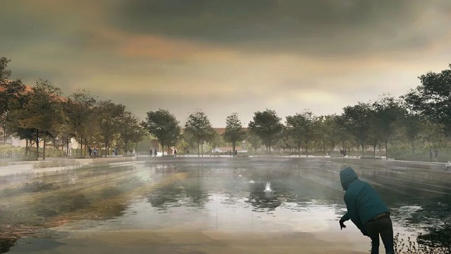 這座公園坐落在山腳下,它的改造基于增設(shè)蓄水空間的想法。混凝土曲棍球場(chǎng)被降低了3m,變成了蓄洪空間。當(dāng)球場(chǎng)蓄滿水后,雨水會(huì)流向下沉式的玫瑰花園,最終匯入湖中。公園中還計(jì)劃建造可調(diào)蓄雨洪的洼地。拉夫恩還提到,公園圍墻的建造能夠有效防止雨水外流,同時(shí)通過(guò)巧妙的設(shè)計(jì),也可避免場(chǎng)地中的古樹(shù)移植。