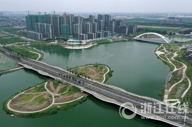 近年來,杭州進(jìn)一步加大海綿城市建設(shè)力度。本組圖片為8月15日記者用無人機鳥瞰杭州錢塘區(qū)東湖防洪調(diào)蓄湖配套工程一期,其北岸的濱水空間“樣板段”已基本完工。該項目水域面積約34.5萬平方米,陸域面積約29.72萬平方米,涵蓋綠地面積約21.8萬平方米。公園以生態(tài)建設(shè)為核心,用多種植物打造水上森林、浩瀚蘆葦灘等特色景觀,延續(xù)生態(tài)野趣的濕地風(fēng)貌,具備水質(zhì)涵養(yǎng)及氣候調(diào)節(jié)等生態(tài)功能。