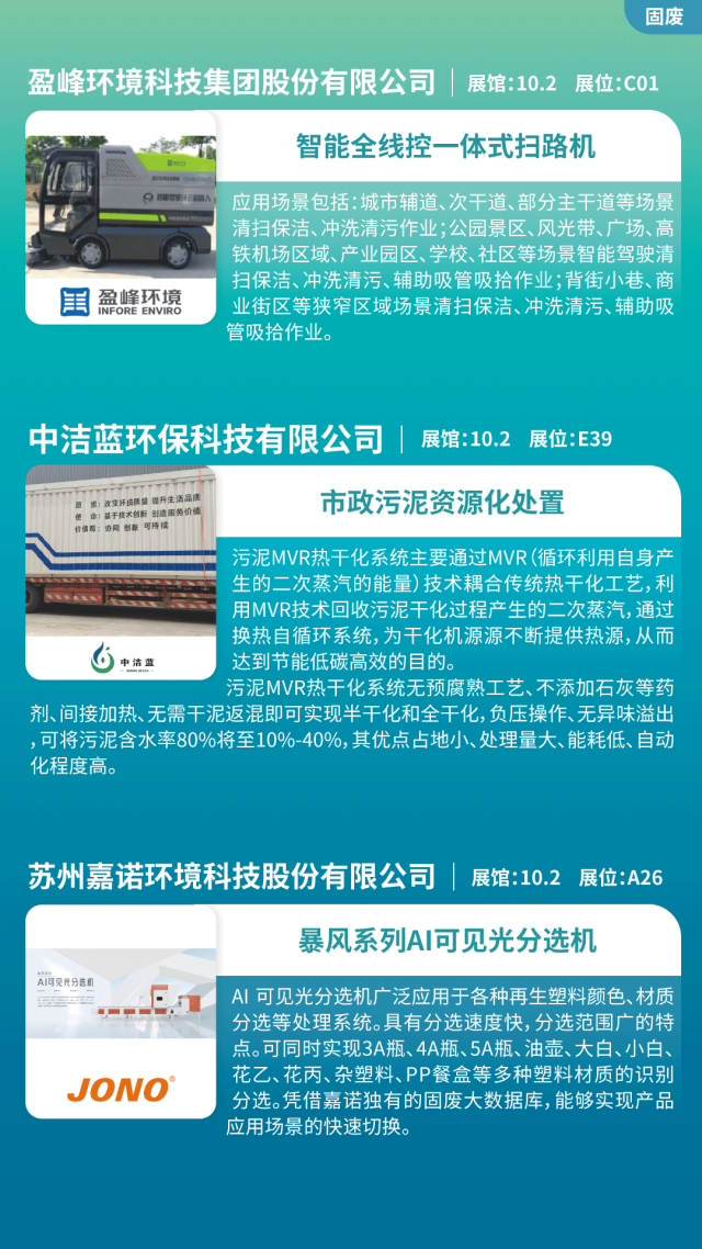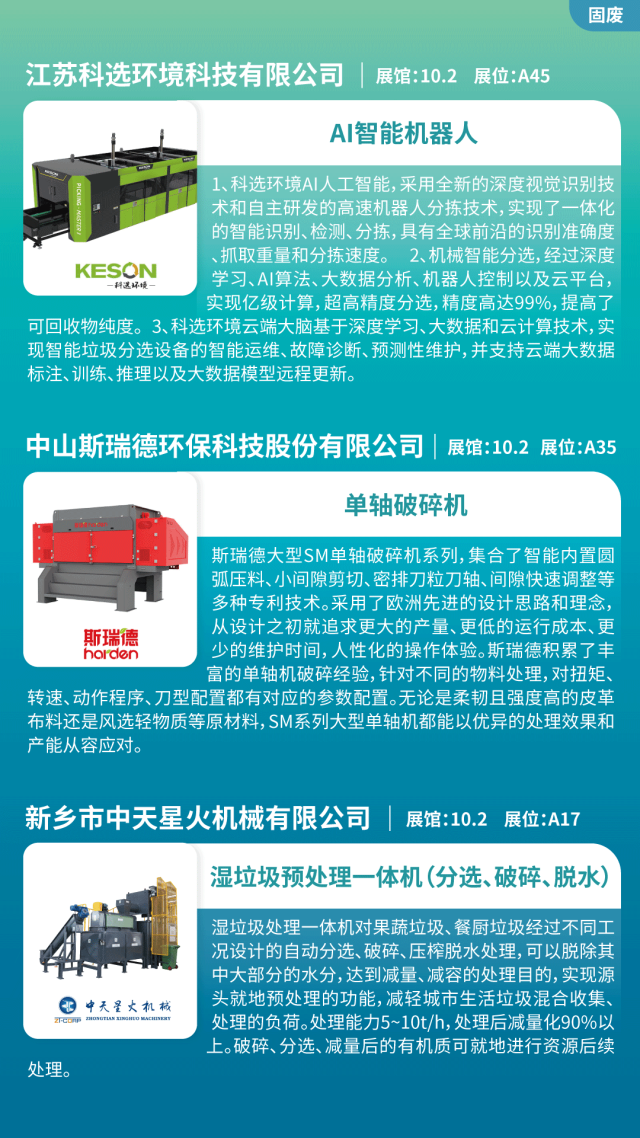 污泥處置、分選機(jī)、垃圾焚燒、餐廚垃圾處理、垃圾滲濾液、垃圾分選機(jī)、破碎機(jī)、脫水機(jī)、濕垃圾處理一體機(jī)、AI智能機(jī)器人、環(huán)衛(wèi)車輛、智能垃圾桶、畜禽廢棄物處置等。