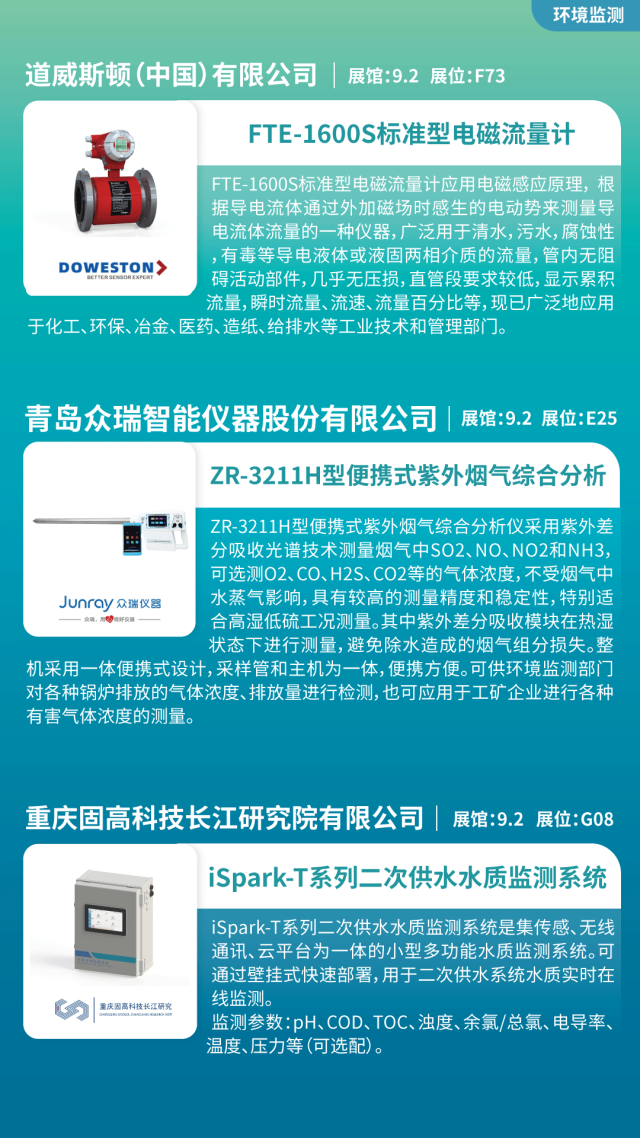 傳感器、水質(zhì)檢測系統(tǒng)、土壤重金屬分析儀、煙氣排放監(jiān)測系統(tǒng)、電磁流量計、智慧AI監(jiān)控系統(tǒng)、便攜式有毒揮發(fā)氣體分析儀、粉塵濃度測量儀、噪聲在線監(jiān)測系統(tǒng)等。