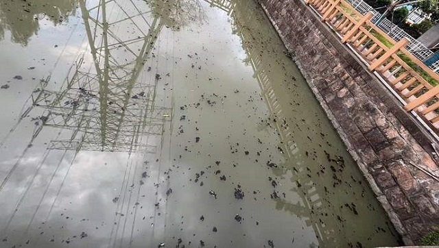 △北竹港的“盲腸”段:河面上漂浮著大量黑色物質。