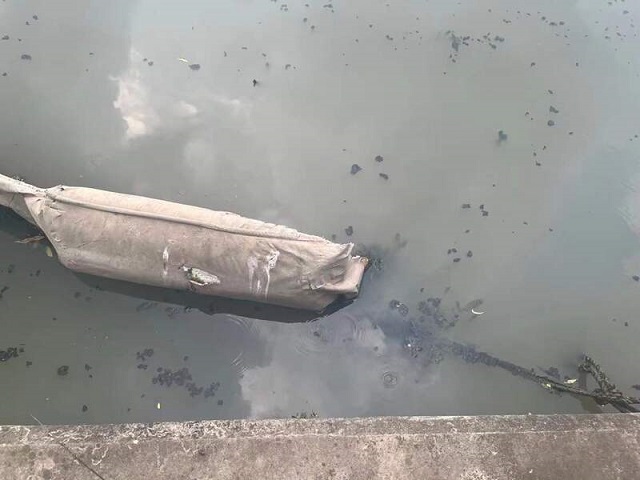 在他的指引下,記者前往該河段查看詳情。臭味正是源自一段長約20米、寬約16米的斷頭河,河道被岸邊整整齊齊的石磚圍成了一塊方形區域,內里的河水幾乎看不到流動,上面還漂浮著大片大片的黑色物質,越靠近臭味愈發難聞。記者在一旁的綠化帶內找了根樹枝,想看看黑色物質到底是什么,沒想到一碰觸,黑色物質馬上散開在了水中。似乎是為了防止黑色物質的擴散,這段“盲腸”和北竹港大河的交界處用一排防污簾做了物理分隔,不過,阻截的措施并不嚴密,在靠北的區域還留有一個缺口,大量的黑色物質順著缺口,流向大河流域。