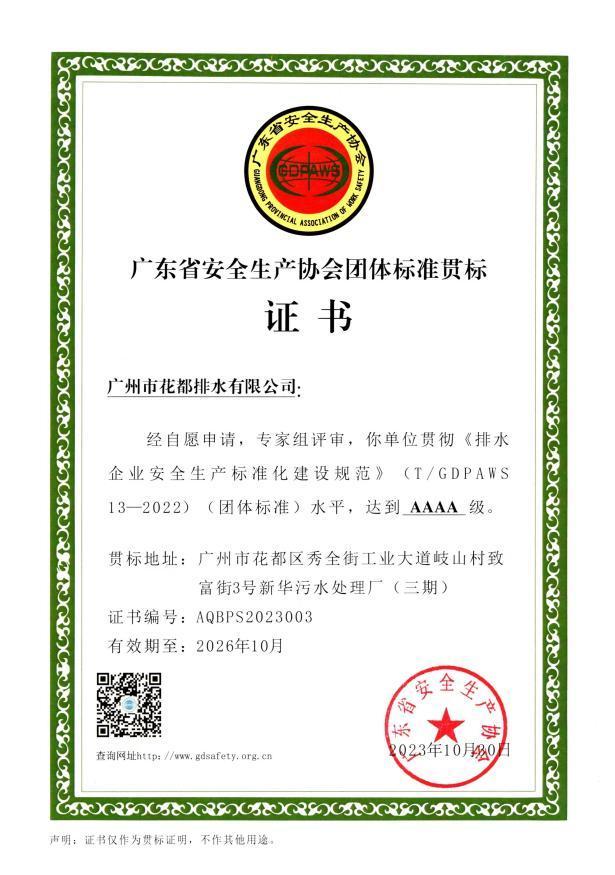 廣州水投花都排水公司獲得排水企業(yè)安全生產(chǎn)標準化AAAA級證書