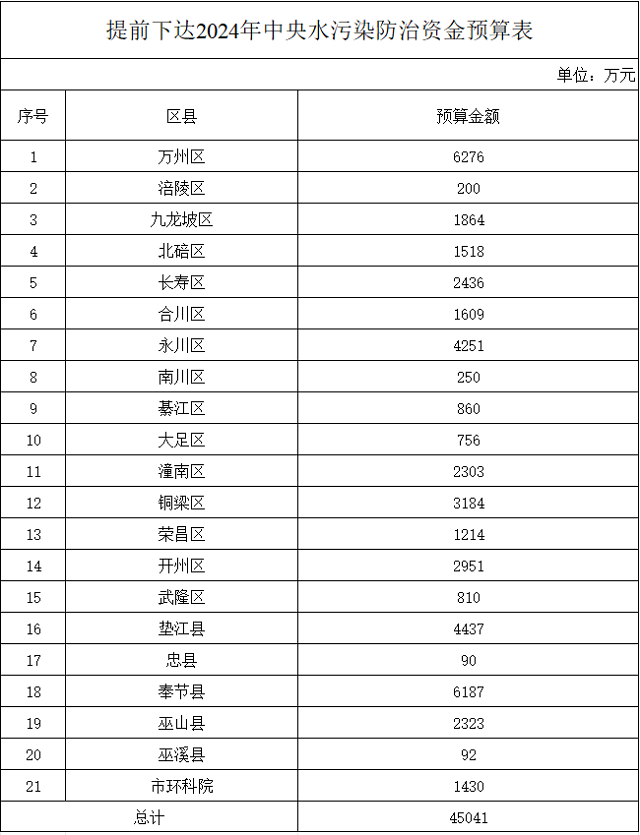 根據(jù)《重慶市財(cái)政局關(guān)于提前下達(dá)2024年中央水污染防治資金預(yù)算的通知》,為促進(jìn)水環(huán)境質(zhì)量改善,加快推進(jìn)水污染防治工作,筑牢長江上游重要生態(tài)屏障,根據(jù)財(cái)政部《關(guān)于提前下達(dá)2024年水污染防治資金預(yù)算的通知》(財(cái)資環(huán)〔2023〕111號(hào))、《水污染防治資金管理辦法》(財(cái)資環(huán)〔2021〕36號(hào))等文件精神,并按照重慶市生態(tài)環(huán)境局《關(guān)于商請(qǐng)?zhí)崆跋逻_(dá)2024年中央水污染防治資金預(yù)算的函》(渝環(huán)函〔2023〕625號(hào)),現(xiàn)將2024年中央水污染防治資金預(yù)算提前下達(dá),專項(xiàng)用于水污染防治和水生態(tài)環(huán)境保護(hù)方面相關(guān)工作。