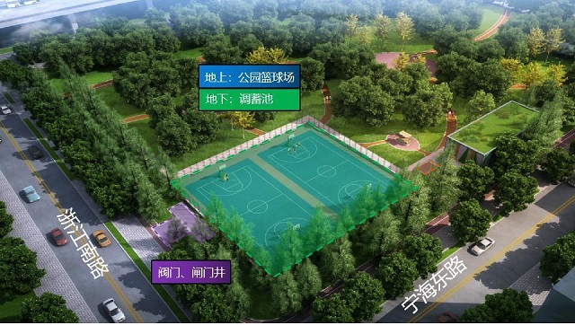 新延安東提標調(diào)蓄池位于黃浦區(qū)延福公園西南角的籃球場下方,總占地面積2926.9平方米。通過打造一座“綠色”提標調(diào)蓄池,并結(jié)合后期少量的管道翻排,能夠?qū)⑾到y(tǒng)內(nèi)排水能力由一年一遇提升至五年一遇,暴雨天啟用調(diào)蓄池后可有效提高系統(tǒng)的防澇能力,確保地區(qū)的防汛安全。同時,項目結(jié)合公園籃球場建設(shè),通過服務(wù)周邊居民,打造環(huán)境改善、休閑活動、城市形象多元化功能體系,實現(xiàn)中心城土地集約化開發(fā)利用,為中心城區(qū)綠色調(diào)蓄設(shè)施的布局建設(shè)作出了良好的示范。