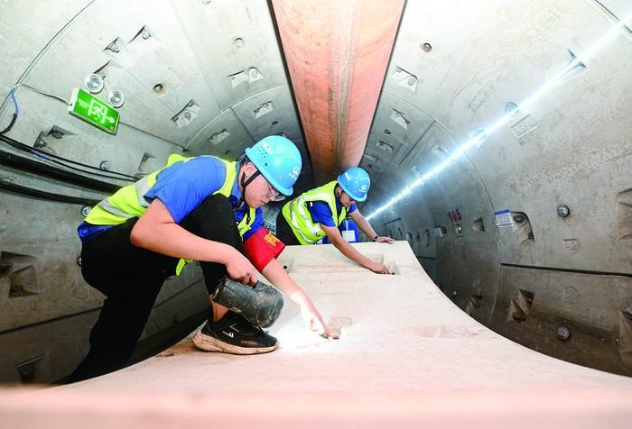 近日,天津市濱海新區(qū)雨污分流改造工程項目雨水主管隧道順利貫通,為項目完工打下堅實基礎。據(jù)介紹,項目建成后,區(qū)域內(nèi)雨水和污水將“各行其道”,有利于提升市政道路排水能力,暢通城市排水管網(wǎng),緩解汛期城市內(nèi)澇問題。圖為工作人員在雨水主管隧道內(nèi)檢查盾構管片。