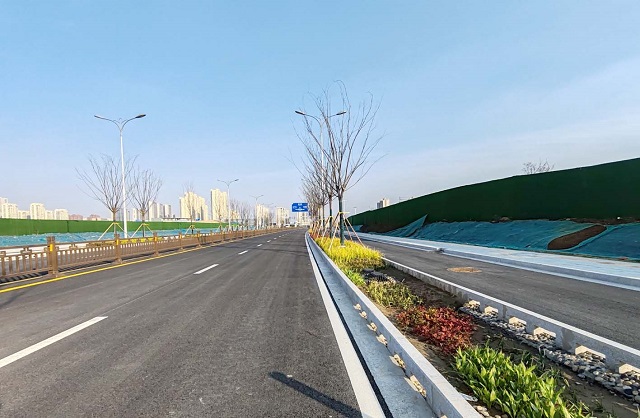 經過施工人員的奮戰,這一段道路快車道已完成瀝青鋪設及路面標線、路牌等配套工作,目前僅剩下西段慢車道的面層瀝青還沒有鋪設,綠化人員正在進行配套綠化施工……整個工程已基本建成,開始進入掃尾階段。