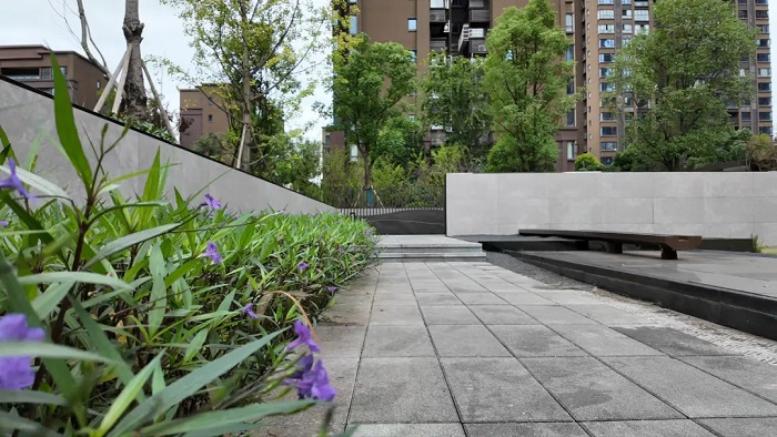 東林道小區將海綿設施功能與景觀環境融合,依托雨水花園打造了充滿自然野趣的景觀小品,雨水花園和透水鋪裝分布在小區內,雨水不會直接從步道流向管渠,而是先進入雨水花園或透水鋪裝滯留和滲透,多余的雨水可流入市政管網或調蓄池,可用于物業灌溉等。如此一來,既保證了路面干爽潔凈,又讓水資源得到了循環利用。