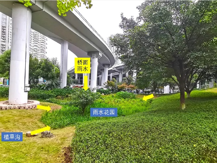 道路與廣場(chǎng) 兩江新區(qū)五里店立交提質(zhì)增效一期,該項(xiàng)目在改造中落實(shí)海綿理念,花小錢辦大事;借助橋下坡地空間,于坡地低洼地帶設(shè)置雨水花園,收水順暢;橋面徑流經(jīng)落水管收集后斷接,在斷接處設(shè)置消能設(shè)施,減少?zèng)_刷;周邊綠地徑流經(jīng)植草溝自然匯流至雨水花園凈化處理。